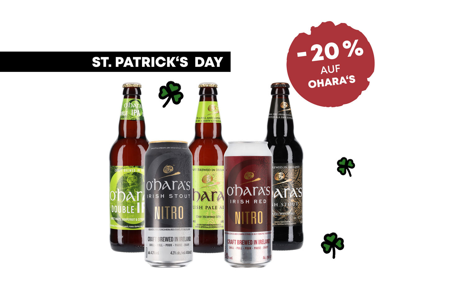 Feiere mit uns den St. Patrick’s Day und genieße bis inkl. Dienstag 20% Rabatt auf alle Biere von O’Hara’s!
